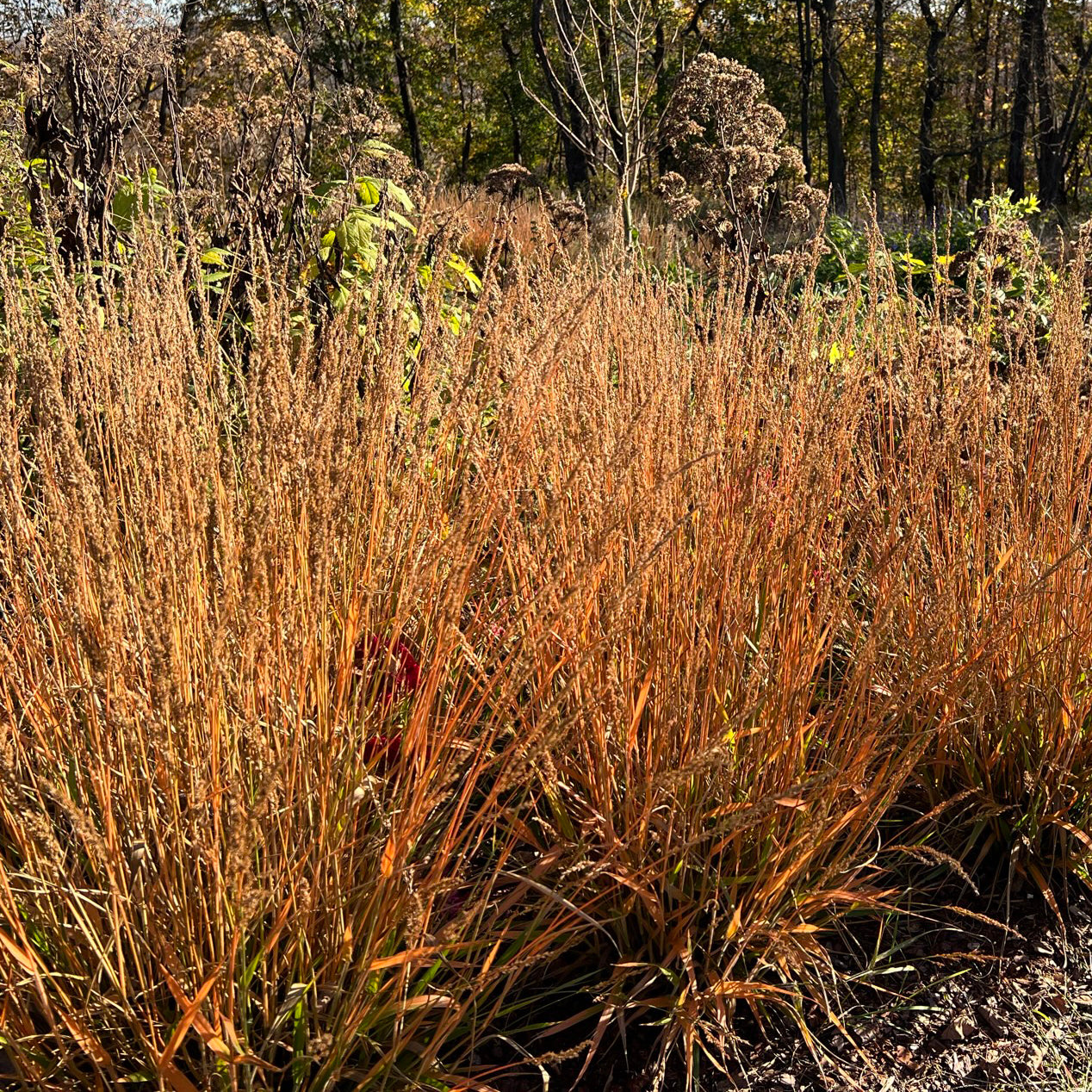 Dwarf, clump forming warm season grass provides a stunning yet smaller grass option for gardens topping out at only about 3’ in full bloom. Glossy green arching leaves are covered in small white hairs that catch light and dew. Numerous golden flower stalks emerge in late summer and mature to a rust color. In fall, foliage turns a coppery orange yellow.