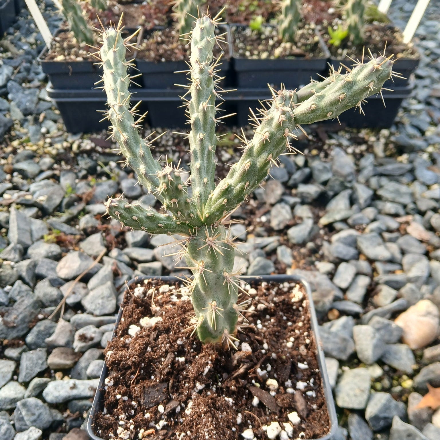 Rare, hardy cholla-type cactus with segmented, cylindrical stems armed with dense spines and bearing greenish-yellow to yellow flowers. Forms a branching, shrubby plant that offers strong architectural interest in xeric plantings. Requires full sun, extremely sharp drainage, and very dry conditions, particularly in winter, to thrive and avoid rot.